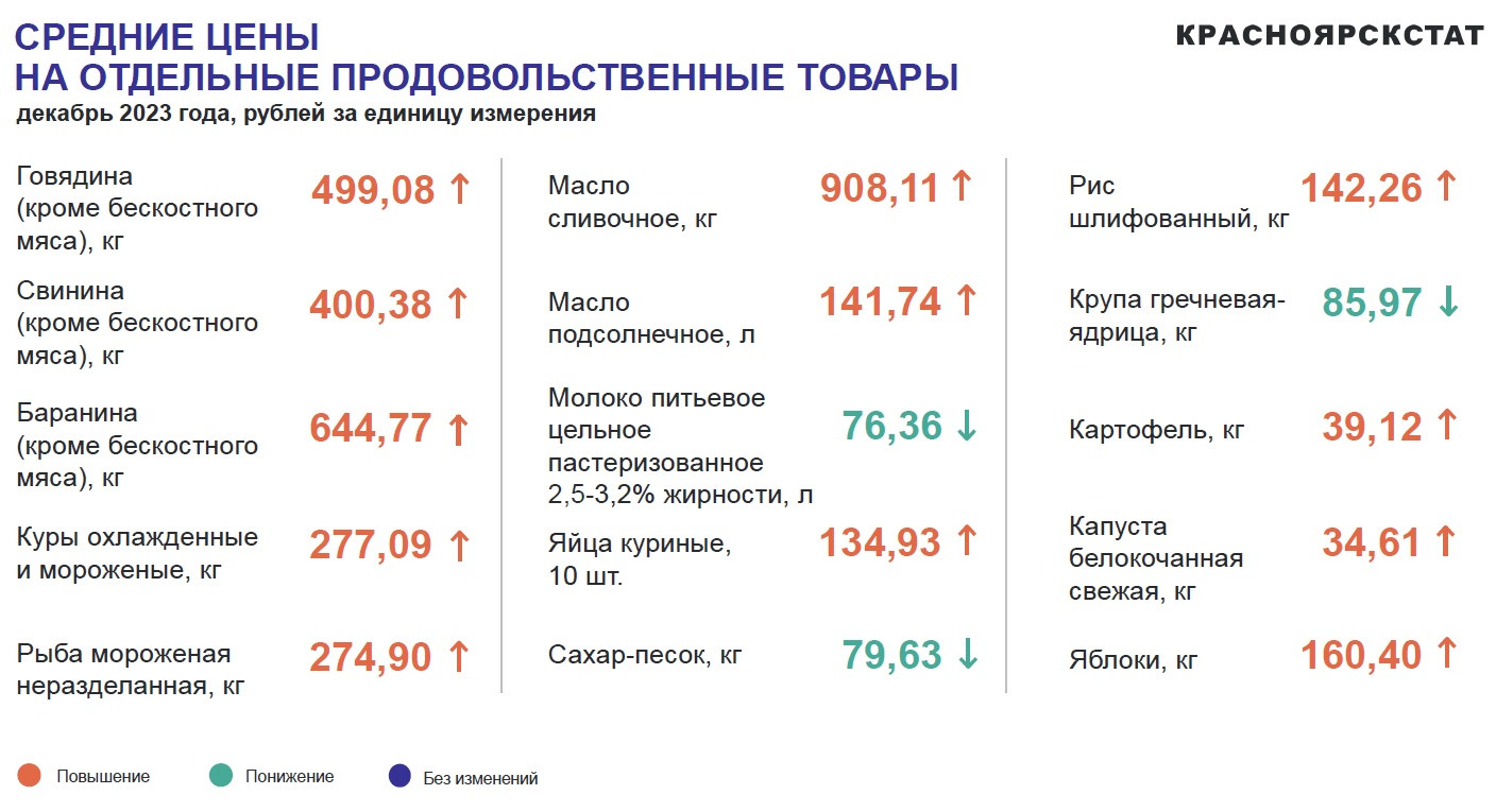 За год (декабрь 2023 года к декабрю 2022 года) цены на потребительском рынке увеличились на 7,8 процента. Среди наблюдаемых 556 товаров и услуг снизились цены по 79 позициям, рост не превышал уровень инфляции по 316 позициям, рост превышал уровень инфляции по 161 позиции.