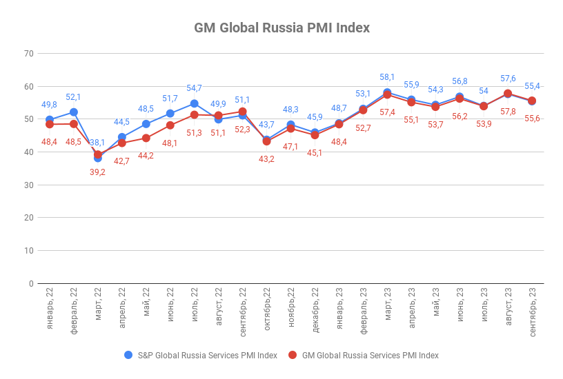 Сентябрьское значение индекса деловой активности ГлобалМедиа PMI (GM Global Services Russia PMI Index) составило 55,6 п.п. против 57,8 п.п. в сентябре. Значение индекса деловой активности в сфере услуг от S&P Global (Global Russia Services PMI by the S&P Global) за аналогичный период снизилось с 57,6 п.п. до 55,4 п.п.