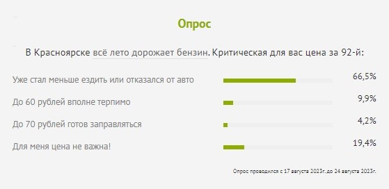 66,5 % респондентов сообщили, что из-за высоких цен на бензин стали ездить на личном авто меньше или вовсе отказались от машины; 19,4 % участников опроса отметили, что для них цены на бензин не имеют значение; 9,9 % рассказали, что продолжат заправлять свою машину только, если литр бензина будет стоить не больше 60 рублей; 4,2 % заявили, что не будут заправляться, если цена за один литр бензина перейдет отметку в 70 рублей.Социологическое исследование проводилось в течение недели — с 17 по 24 августа 2023 года. За это время в опросе на официальном сайте Newslab приняли участие 474 человека.