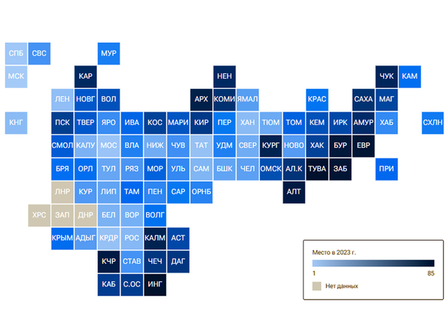Еврейская автономная область (33,388) Ингушетия (33,261) Тыва (26,506) МетодикаРейтинг составлен Центром экономических исследований «РИА Рейтинг» медиагруппы «Россия сегодня» и построен на основе комплексного учета различных показателей, фиксирующих фактическое состояние тех или иных аспектов условий жизни и ситуации в социально-экономической сфере. При расчете рейтинга проводился анализ 66 показателей, которые объединены в 11 групп, характеризующих основные аспекты качества жизни в регионе: уровень доходов населения, занятость населения и рынок труда, жилищные условия населения, безопасность проживания, демографическая ситуация, экологические и климатические условия, здоровье населения и уровень образования, обеспеченность объектами социальной инфраструктуры, уровень экономического развития, уровень развития малого бизнеса, освоенность территории и развитие транспортной инфраструктуры. В основу легли данные Росстата, Минздрава, Минфина, Центробанка и других открытых источников за 2022…2023. Рейтинговый балл изменяется в диапазоне 1…100. Источник: РИА Новости Читайте далее Красноярский МСБ привлек 7 млрд кредитных средств под «зонтичные» поручительства за 2023