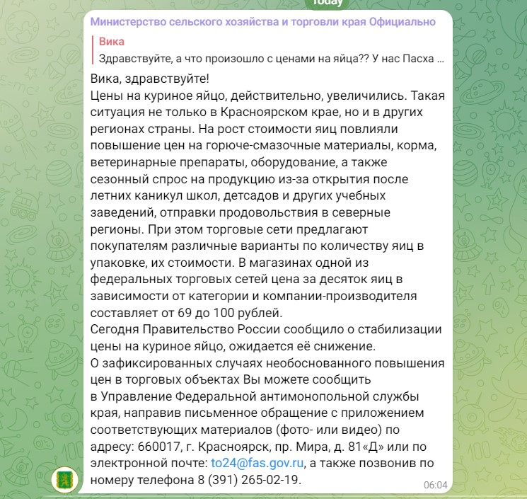 «Цены на куриное яйцо, действительно, увеличились. Такая ситуация не только в Красноярском крае, но и в других регионах страны. На рост стоимости яиц повлияли повышение цен на горюче-смазочные материалы, корма, ветеринарные препараты, оборудование, а также сезонный спрос на продукцию из-за открытия после летних каникул школ, детсадов и других учебных заведений, отправки продовольствия в северные регионы. При этом торговые сети предлагают покупателям различные варианты по количеству яиц в упаковке, их стоимости. В магазинах одной из федеральных торговых сетей цена за десяток яиц в зависимости от категории и компании-производителя составляет от 69 до 100 рублей», — сказано в сообщении.