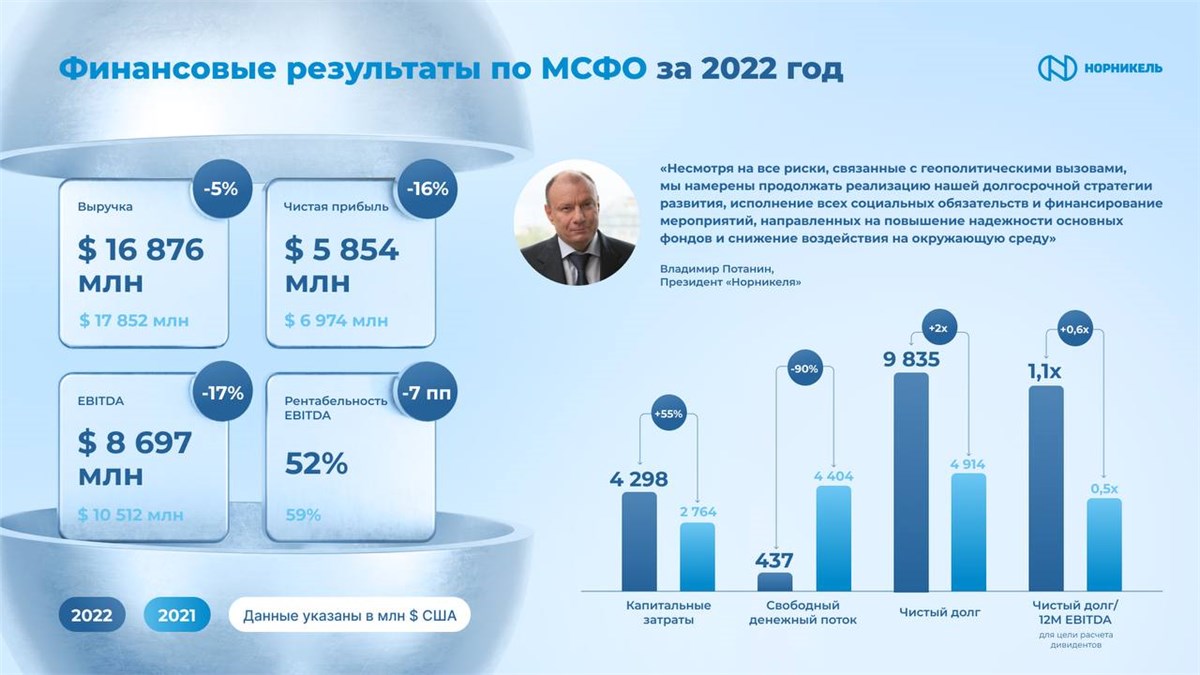 «В прошлом году российская экономика в целом и наша компания в частности столкнулись с целым рядом экстремальных вызовов. С одной стороны, беспрецедентное санкционное давление на Россию вынудило нас максимально оперативно перестраивать свою операционную, закупочную, сбытовую и финансовую деятельность, чтобы минимизировать возникшие риски для нашего бизнеса, сотрудников и ключевых стейкхолдеров. С другой стороны, рост геополитической напряженности, скачок мировых цен на энергоносители и повышение процентных ставок ведущими центральными банками, привели к резкому росту инфляции и усилили волатильность на глобальных сырьевых и финансовых рынках, что не могло не отразиться на ключевых финансовых показателях нашей Компании», — прокомментировал финансовые результаты президент «Норникеля» Владимир Потанин.