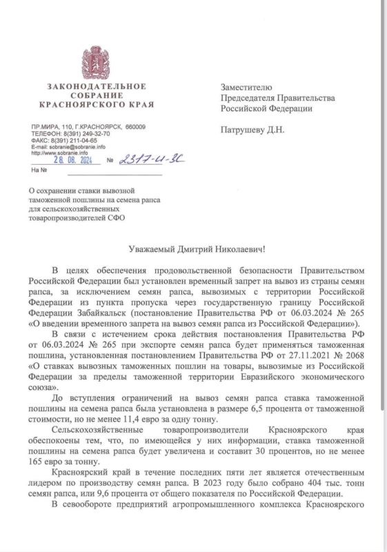 Члены аграрного комитета Законодательного Собрания Красноярского края подготовили обращение к председателю Государственной Думы Вячеславу Володину и вице-премьеру Правительства РФ Дмитрию Патрушеву с просьбой принять взвешенное решение по ставкам таможенной пошлины на экспорт рапса.