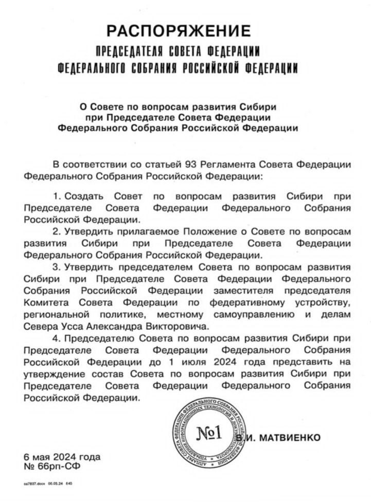 Согласно опубликованному документу, Александр Усс утверждён руководителем Совета по вопросам развития Сибири при председателе Совета Федерации. Это постоянно действующий экспертно-консультативный орган. Среди основных задач - подготовка предложений по вопросам стратегического планирования и совершенствование законодательства в целях социально-экономического развития Сибири.