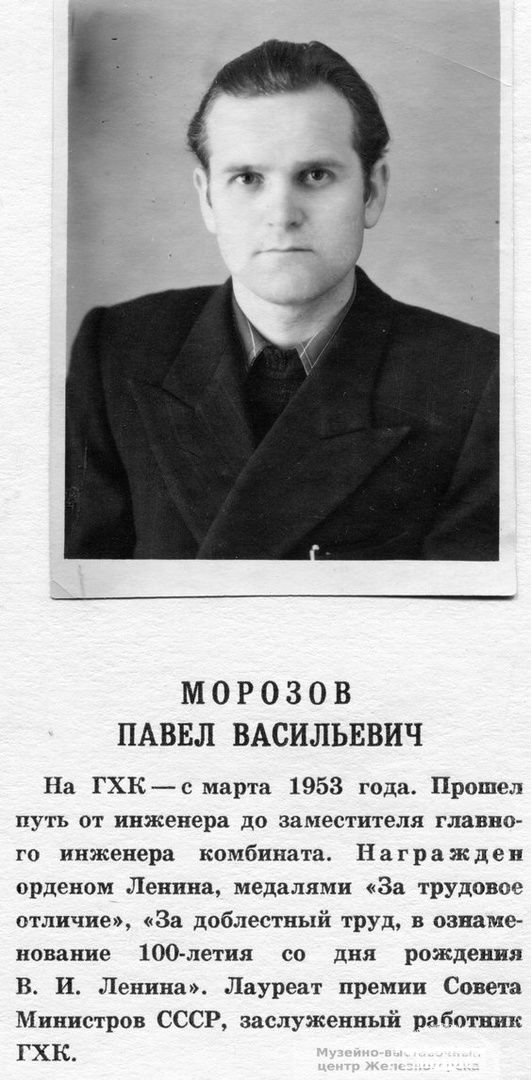 26 марта 1953 года молодой специалист Павел Морозов был оформлен на работу в п/я 135 – инженером-конструктором технического отдела. Он примет участие в запуске трех промышленных уран-графитовых реакторов Горно-химического комбината, возглавит гидрометаллургический (реакторный) завод, будет работать заместителем главного инженера ГХК. На два десятка лет станет рупором комбината в борьбе с радиофобией, его летописцем и основателем службы общественной информации.