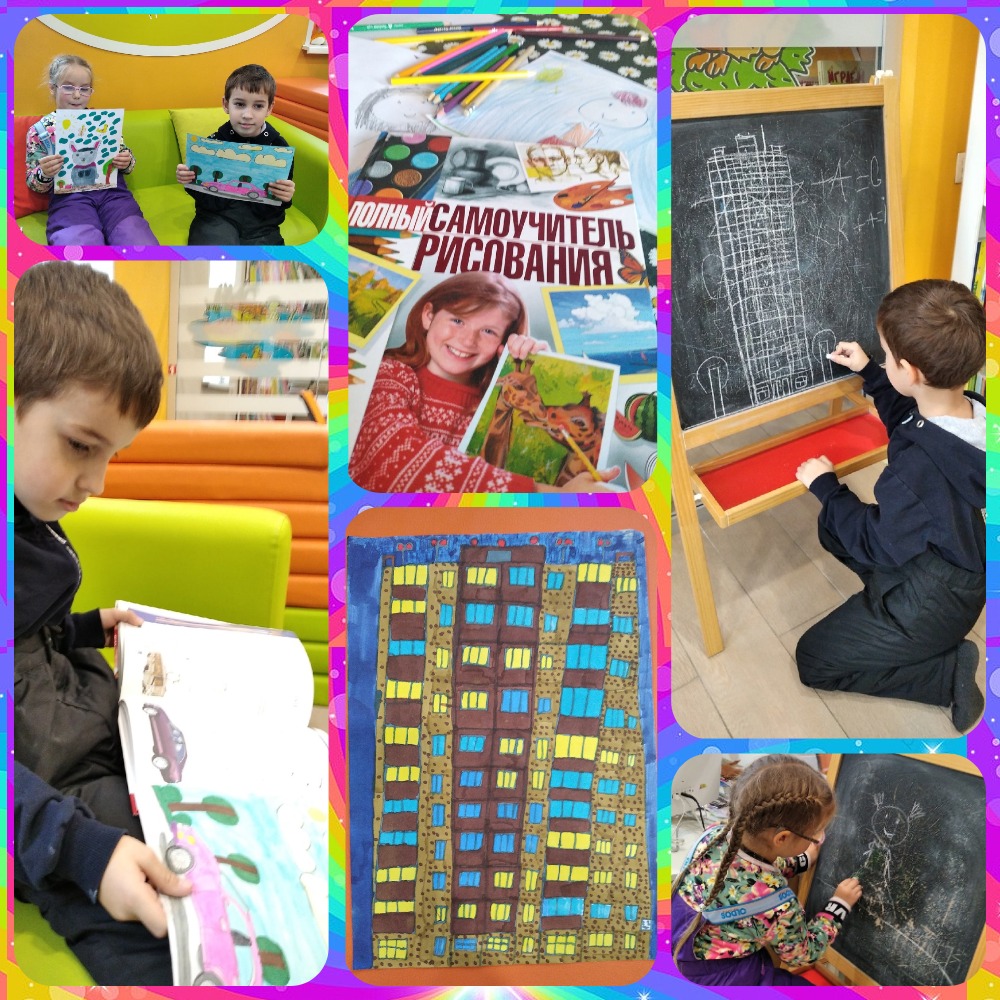 Сегодня они посещали нас вместе с мамой и папой. И принесли свои яркие рисунки, рассказали, что учились рисовать предметы, используя самоучитель, который выбрал для них папа в библиотеке.