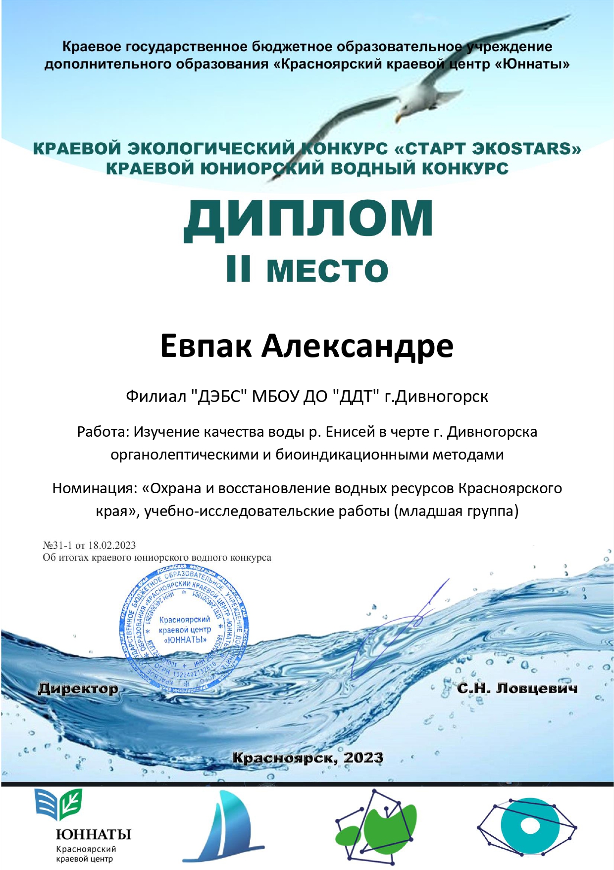 По итогам финала Конкурса в номинации «Охрана и восстановление водных ресурсов Красноярского края» дипломом за 2 место в младшей возрастной группе награждена Евпак Александра из 4 класса школы №4с учебно-исследовательской работой по теме «Изучение качества воды р. Енисей в черте г. Дивногорска органолептическими и биоиндикационными методами».