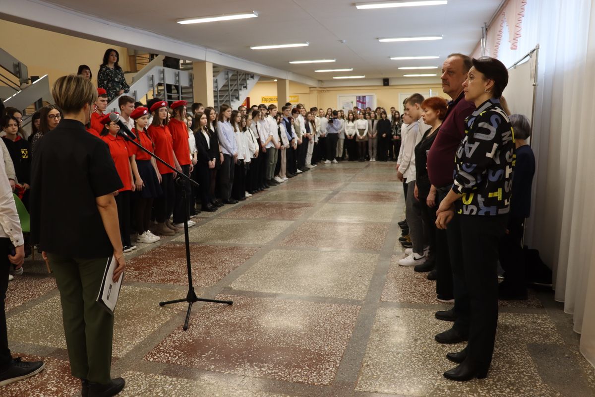 На торжественный митинг собрались педагоги и старшеклассники школы №5, а также волонтёры Российского движения школьников. Почетными гостями мероприятия стали депутат городского совета депутатов Татьяна Клапоцкая, а также родственники погибших в СВО Юрия Кузнецова и Константина Зимина.