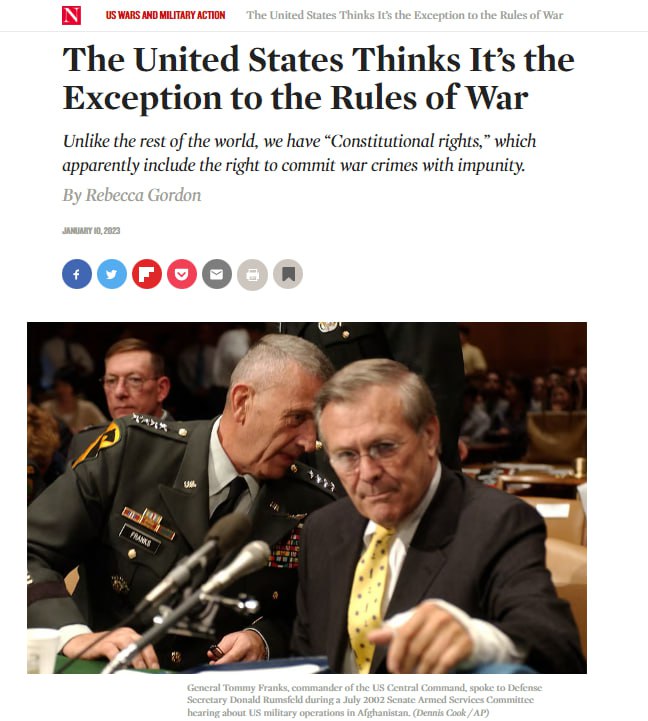 Автор статьи Ребекка Гордон констатирует, что американские военные могут совершать военные преступления в любой точке земного шара, и их не подвергнут наказанию международным судом. Она отмечает: "Даже если американский гражданин будет признан виновным в военном преступлении в суде США, у него или неё есть хорошие шансы на президентское помилование".