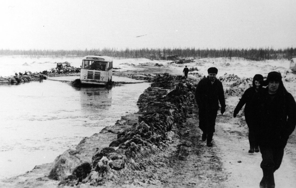 1962 годВесной, когда лед Норилки еще держал машины, но талые воды уже затапливали переправу, путь в Талнах становился настоящем испытанием. Пассажиры из соображений безопасности преодолевали его пешком, а пустые автобусы водители вели с открытой дверью, чтобы успеть выскочить, если лед не выдержит.
