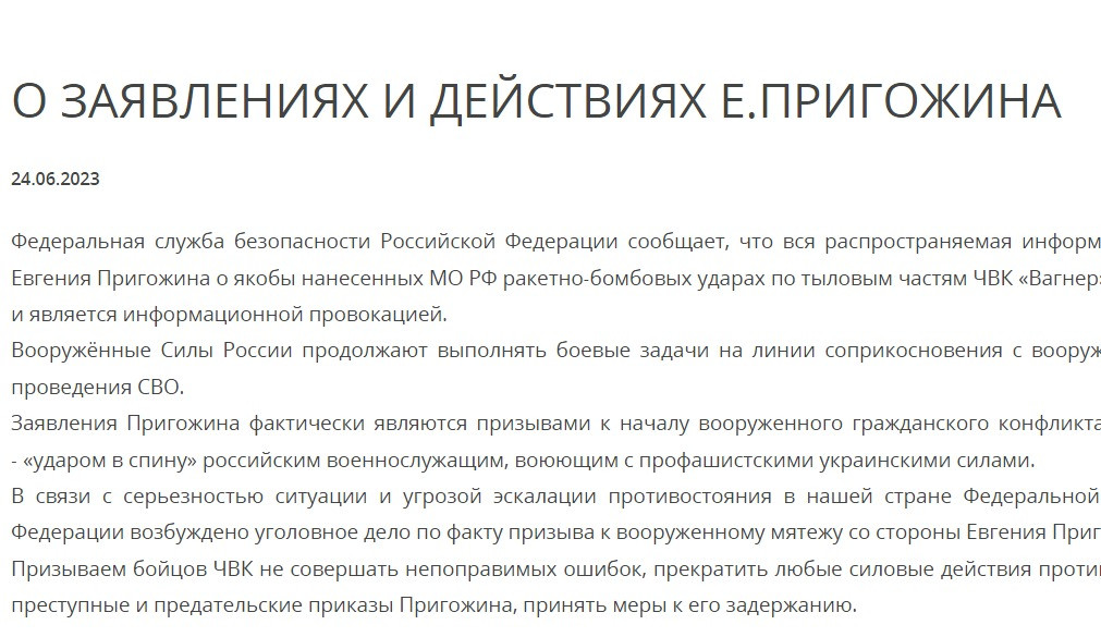 Уголовное дело по факту призыва к мятежу со стороны Пригожина возбуждено в связи с серьёзностью ситуации и угрозой эскалации противостояния в РФ, пояснили в ЦОС ФСБ.