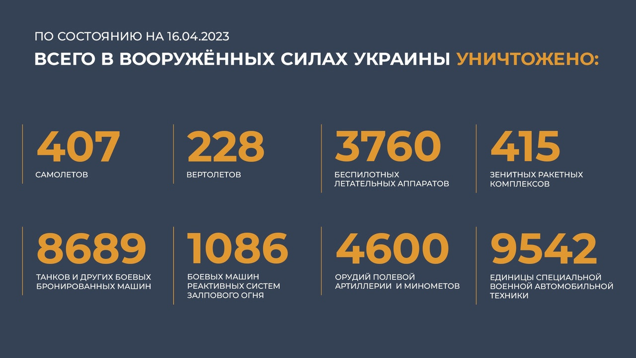 Всего с начала проведения специальной военной операции уничтожены: 407 самолётов, 228 вертолётов, 3 760 беспилотных летательных аппаратов, 415 зенитных ракетных комплексов, 8 689 танков и других боевых бронированных машин, 1 086 боевых машин реактивных систем залпового огня, 4 600 орудий полевой артиллерии и миномётов, а также 9 542 единицы специальной военной автомобильной техники.