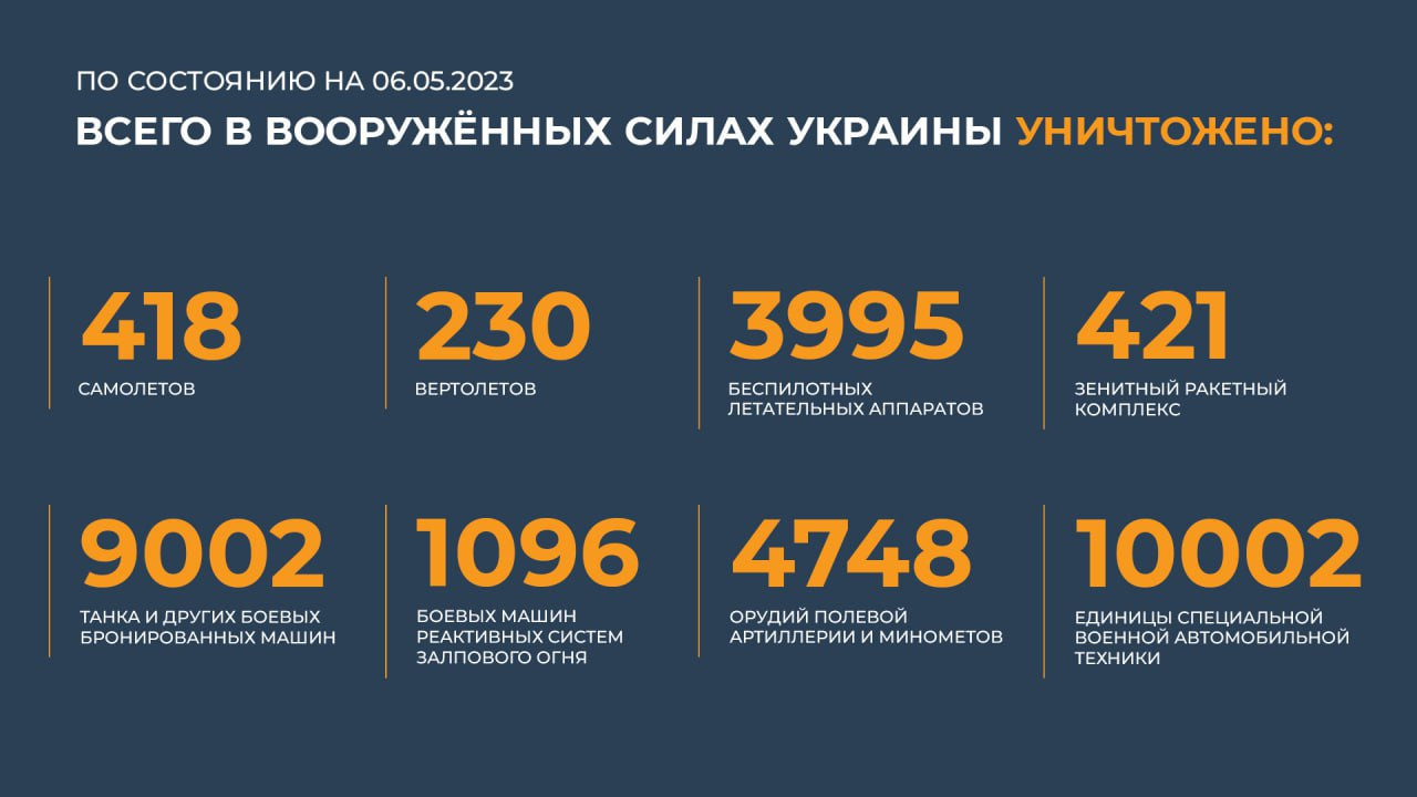 Всего с начала проведения специальной военной операции уничтожено: 418 самолётов, 230 вертолётов, 3 995 беспилотных летательных аппаратов, 421 зенитный ракетный комплекс, 9 002 танка и других боевых бронированных машин, 1 096 боевых машин реактивных систем залпового огня, 4 748 орудий полевой артиллерии и минометов, а также 10 002 единицы специальной военной автомобильной техники.