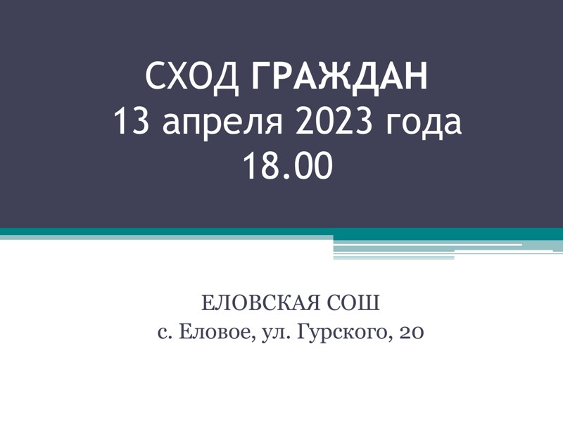 Сход жителей Еловского сельсовета состоится 13 апреля в 18.00 в Еловской СОШ по адресу: с. Еловое, ул. Гурского, 20