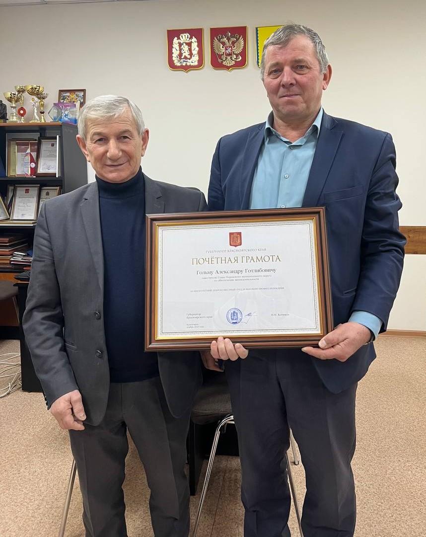 Почетной грамотой Губернатора Красноярского края отмечен труд заместителя главы Пировского округа по жизнеобеспечению Александра Готлибовича Гольма.