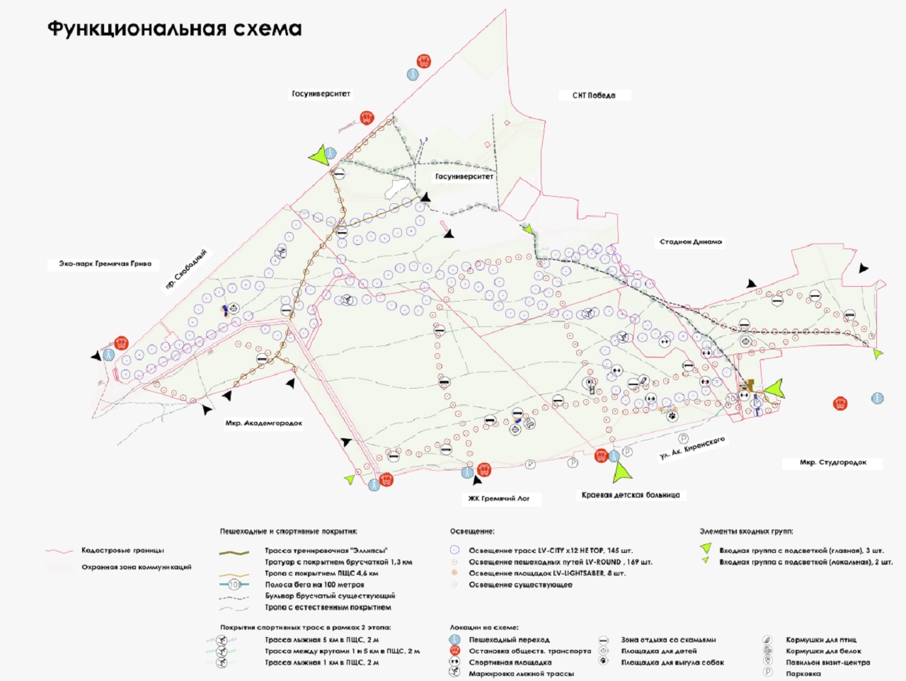Подробная схема нового общественного пространства. Он займет большую территорию от Верхнего Академгородка до стадиона Динамо в Студгородке