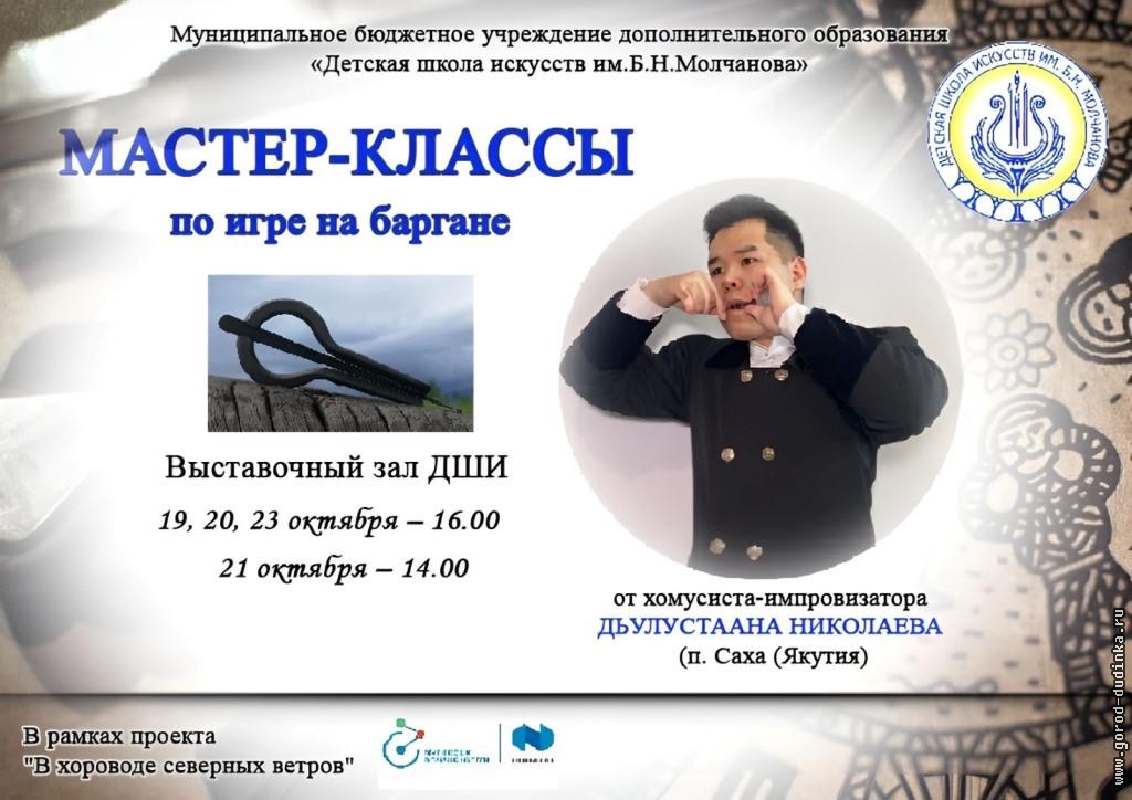 С 19 по 23 октября в выставочном зале учреждения пройдут мастер-классы по игре на баргане, которые проведет хомусист-импровизатор Дьулустаан Николаев из Якутии. Музыкант продемонстрирует возможности северного музыкального инструмента.