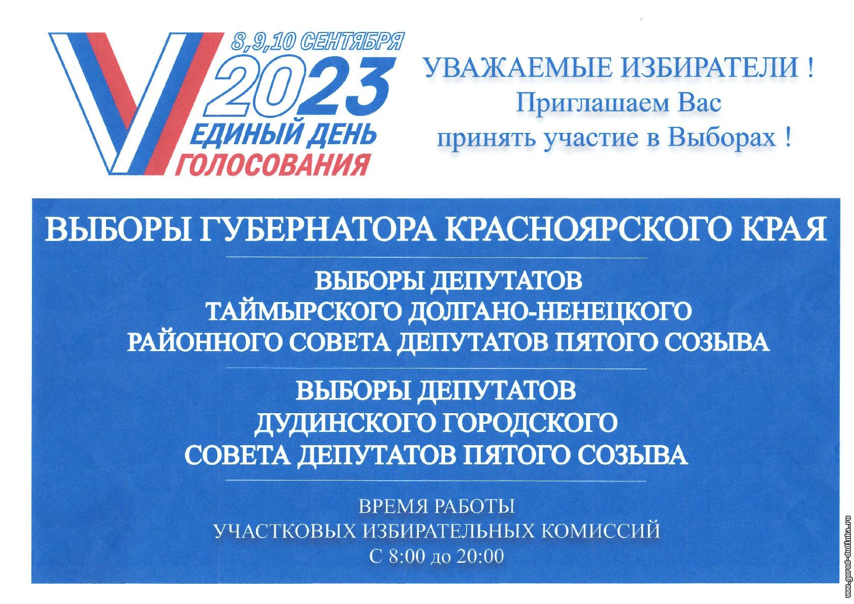Уже через неделю, 8, 9 и 10 сентября дудинцы смогут проголосовать за кандидатов в губернаторы Красноярского края, в депутаты Таймырского Долгано-Ненецкого муниципального района пятого созыва и Дудинского городского Совета пятого созыва. Для учета волеизъявления граждан на территории города Дудинки и в дудинских поселках с 8:00 до 20:00 будут работать 13 избирательных участков.