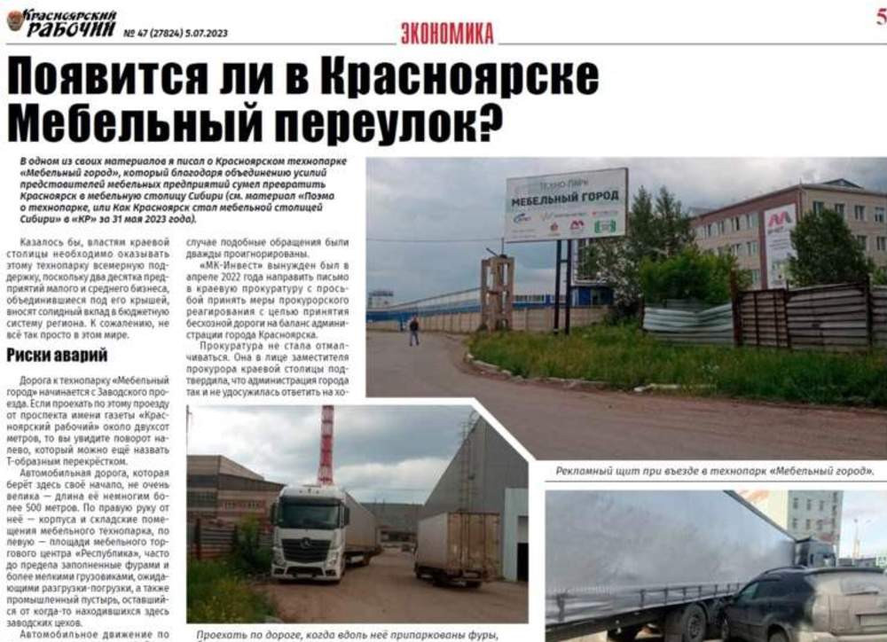 Предыстория этой публикации вкратце такова. 5 июля 2023 года в "Красноярском рабочем" был опубликован материал Владимира Пантелеева "Появится ли в Красноярске Мебельный переулок?" . В нём рассказывалось о том, с какими проблемами столкнулись предприятия Красноярского технопарка "Мебельный город" при попытках создать условия для безопасного дорожного движения по безымянному проезду, ведущему к технопарку.