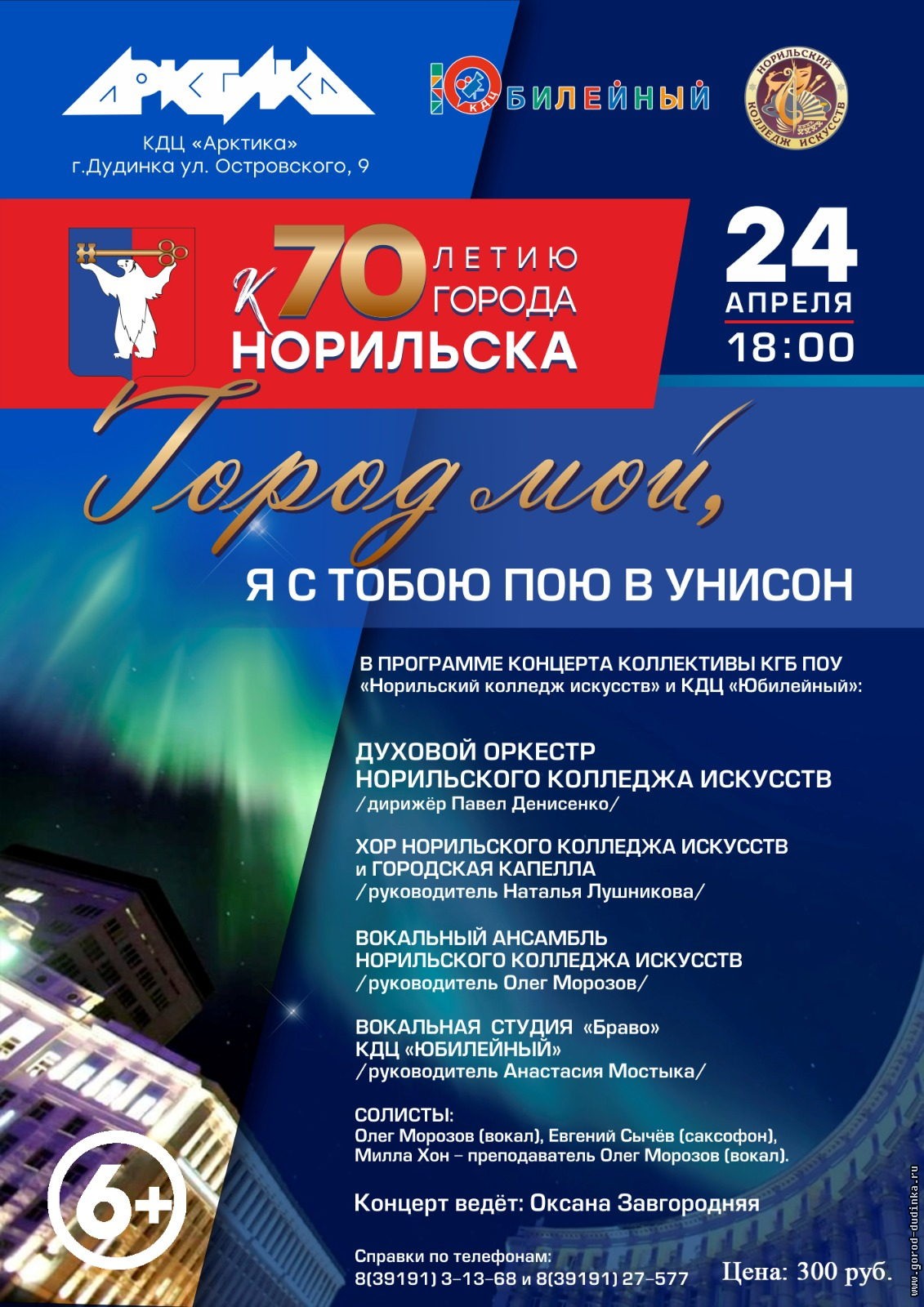 Концерт под таким названием, посвященный 70-летию города Норильска, предлагают посетить дудинцам в кинодосуговом центре «Арктика» 24 апреля.