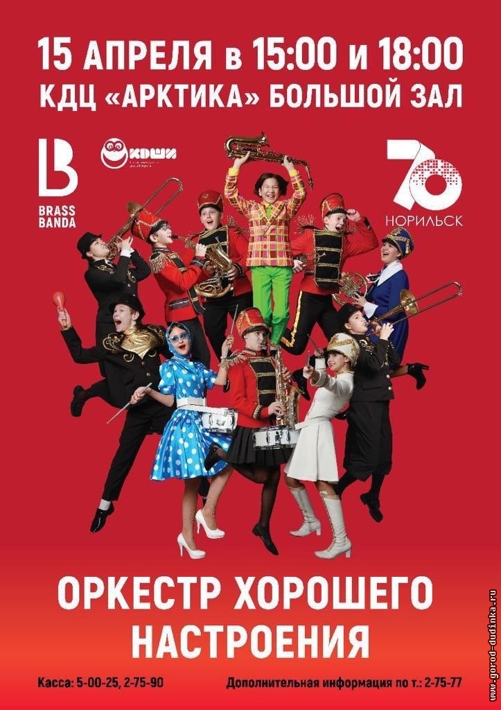 В связи с погодными условиями Образцовый художественный коллектив «BrassBanda» не смог выехать на гастроли в Дудинку. Запланированные на 2 апреля выступления состоятся 15 апреля в 15:00 и 18:00. Организаторы отмечают, что билеты, приобретенные на 2 апреля, будут действительны.