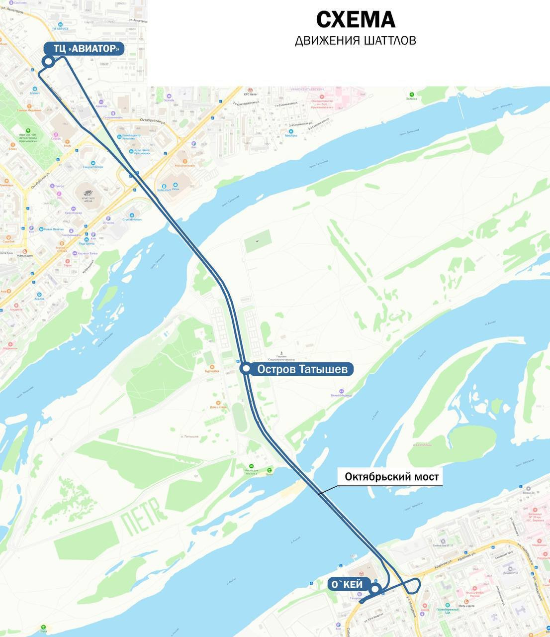 Для удобства горожан решено запустить бесплатные шаттлы. 4 автобуса большого класса вместимости будут курсировать с 11:15 до 17:30 между ТЦ "Авиатор" на Взлётке и гипермаркетом "О'КЕЙ" на правом берегу. Интервал движения составит 5 минут.