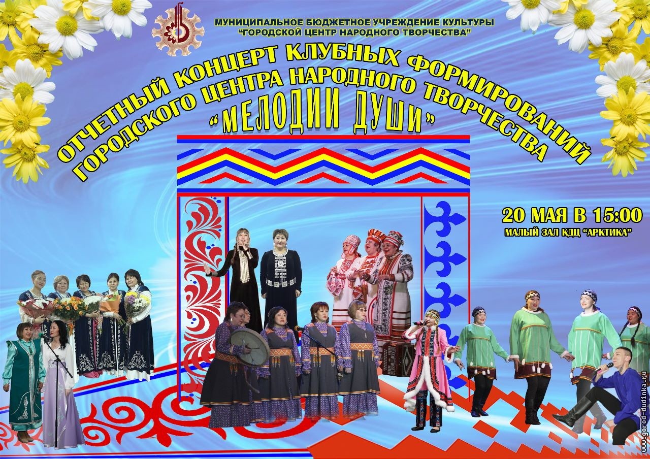 20 мая в 15:00 в малом зале кинодосугового центра «Арктика» состоится отчётный концерт коллективов городского Центра народного творчества «Мелодии души».