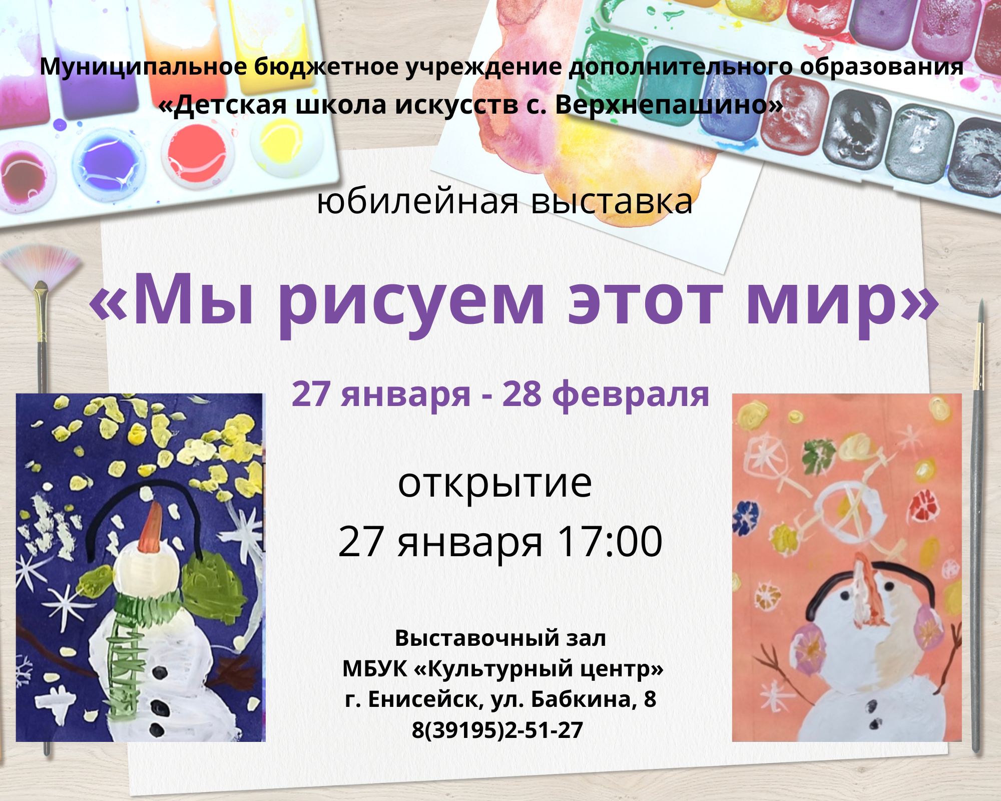 Детская школа искусств с. Верхнепашино приглашает посетить открытие юбилейной выставки «Мы рисуем этот мир» 27 января в 17:00, в Выставочном зале МБУК «Культурном центре г. Енисейска.