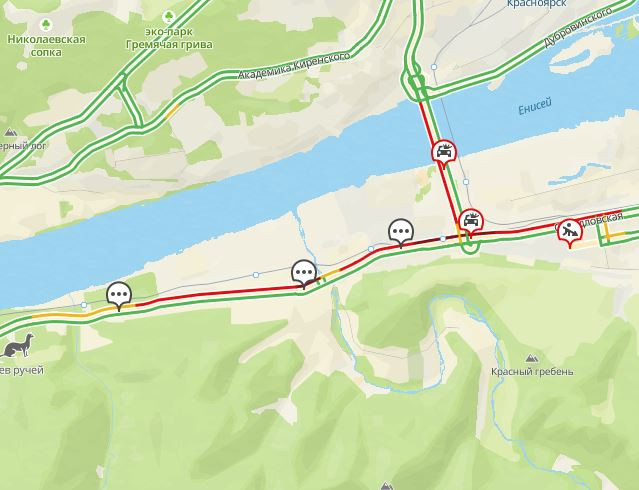 Длина затора составляет примерно 7 километров. Он растянулся от Водомётного переулка до парка "Роев ручей". Также стоит Николаевский мост в сторону правого берега. Судя по карте 2gis, ситуацию усугубляют 2 ДТП.