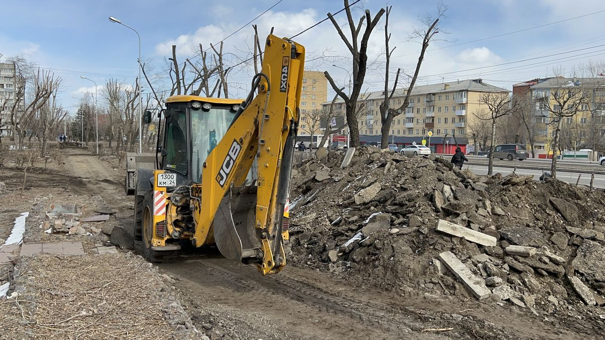 Речь идёт об участке проспекта имени газеты "Красноярский рабочий" от Предмостной площади до цирка. Сейчас подрядчик занимается демонтажем старых тротуаров и бордюрных камней, сносит небольшие подпорные стенки и выравнивает землю. Помимо этого, в прошлом месяце здесь были организованы санитарные, омолаживающие и формовочные обрезки зелёных насаждений.