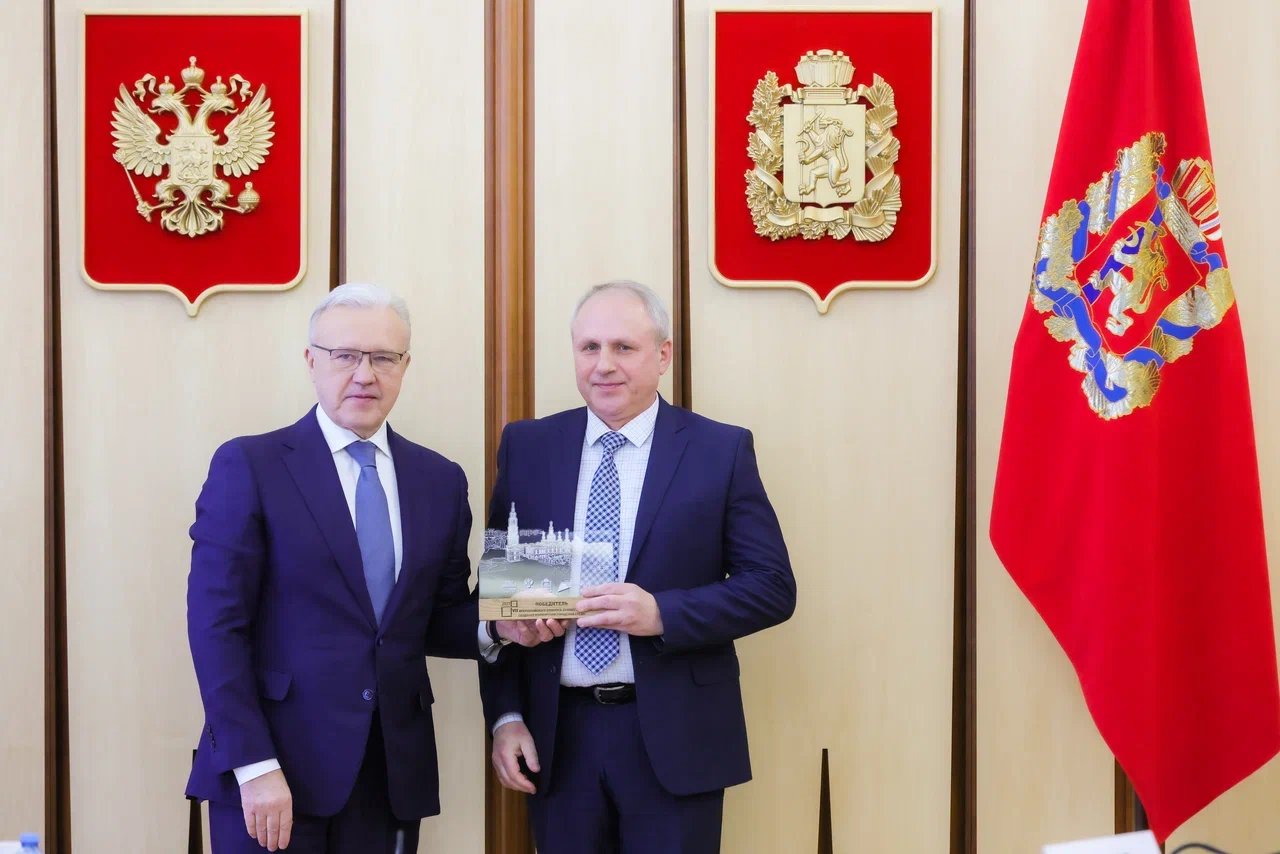 Глава города Шарыпово Вадим Хохлов получил награду от Губернатора Красноярского края Александра Уса за победу города во Всероссийском конкурсе лучших проектов создания комфортной городской среды.
