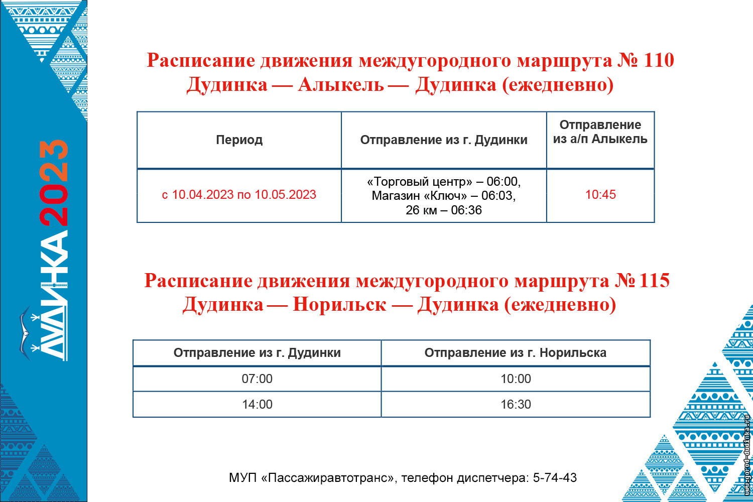 Обращаем внимание горожан, что с 10 апреля по 10 мая внесены временные изменения в расписание отправления автобусов из аэропорта «Норильск» (110 маршрут): от остановки на территории аэровокзала в направлении города Дудинки — ежедневно в 10:45. Данное изменение внесено Министерством транспорта Красноярского края для выявления потребности в изменении времени отправления автобуса из аэропорта. По истечению месяца, в минтрансе сопоставят количество пассажиров, перевезенных в период работы по обычному расписанию и скорректированному, и на основании этих данных будет приниматься решение об утверждении наиболее востребованного времени отправления автобуса.