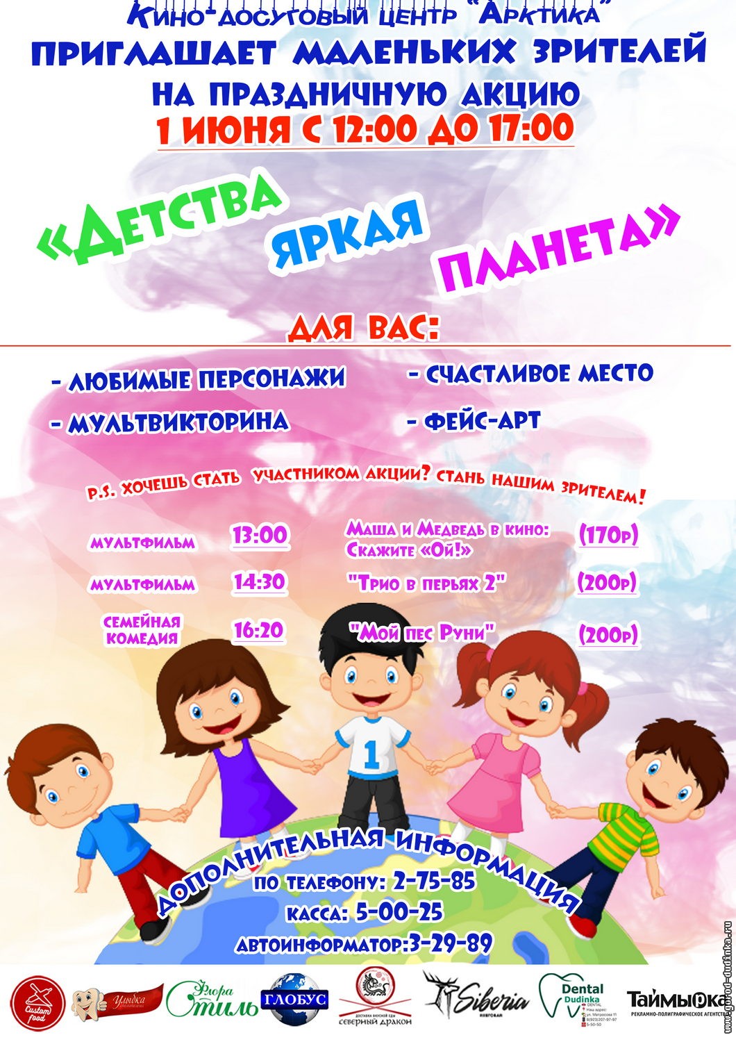 В Международный День защиты детей, 1 июня, с 12:00 до 17:00 в кинодосуговом центре «Арктика» пройдет акция «Детства яркая планета».