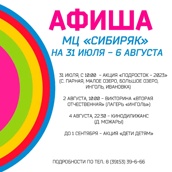 Молодежный центр «Сибиряк» еженедельно организует социально-значимые, образовательные и развлекательные мероприятия для сельских жителей. Актив центра приглашает принять участие запланированными событиями молодежного центра на следующую неделю.