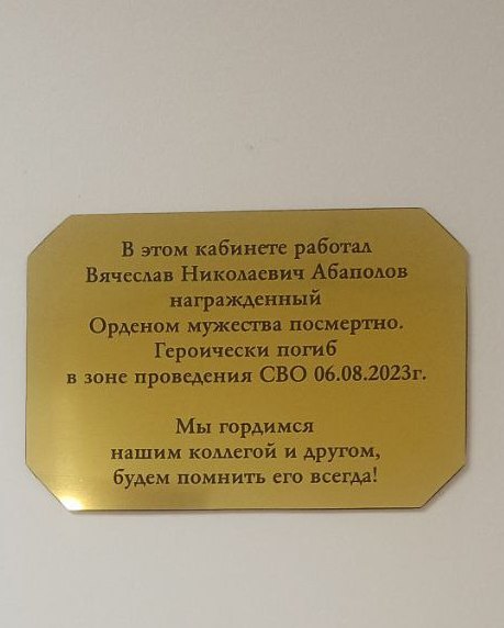 Мемориальную табличку разместили у кабинета, в котором в 2022-2023 году работал Вячеслав Николаевич Абаполов, посмертно награждённый орденом Мужества.