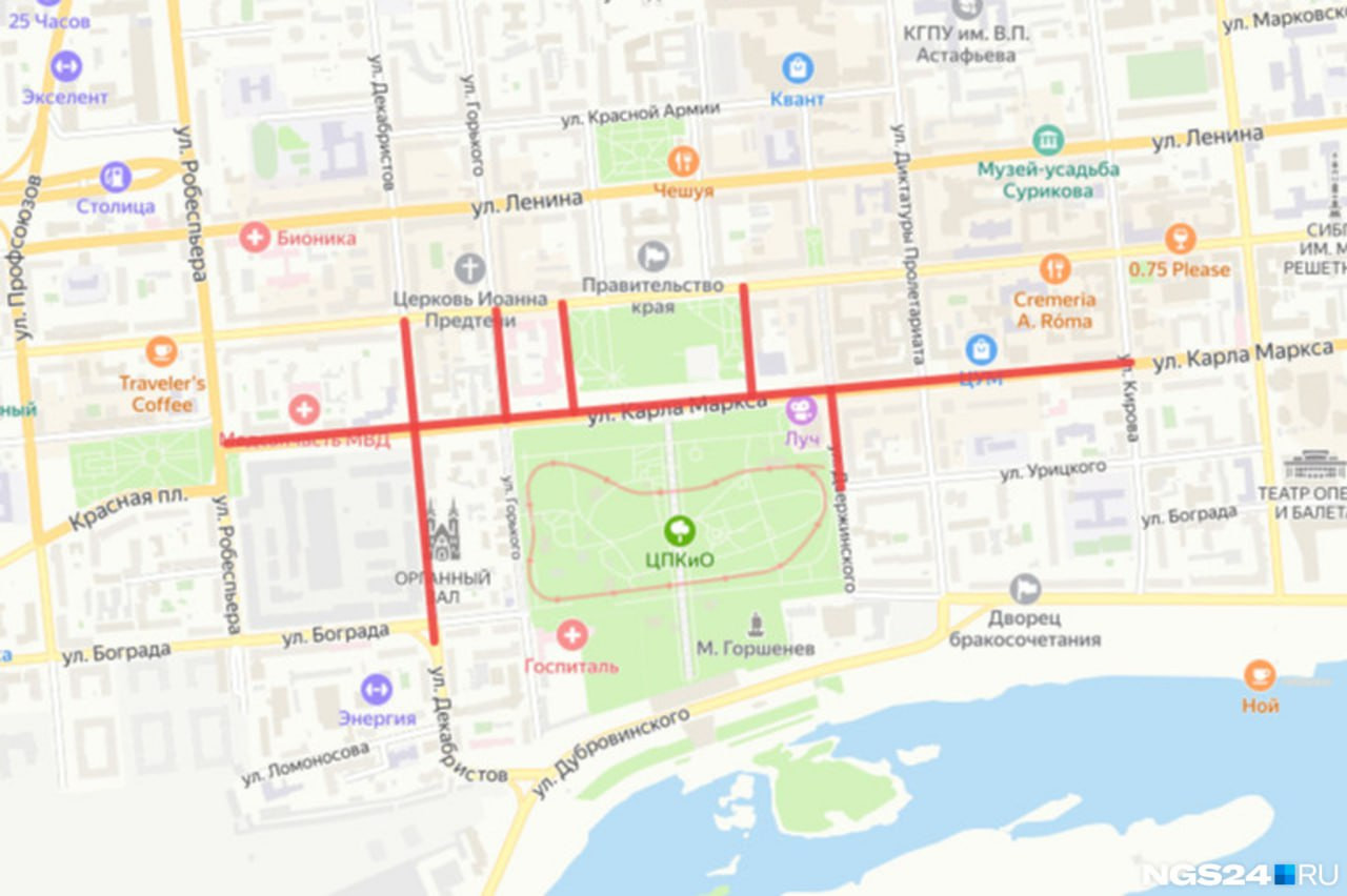 улица Карла Маркса от Робеспьера до Кирова; проезды вдоль Государственной универсальной научной библиотеки Красноярского края и здания РЖД от проспекта Мира до улицы Карла Маркса; улица Декабристов от проспекта Мира до Бограда; улица Горького от проспекта Мира до Карла Маркса; улица Дзержинского от Карла Маркса до Урицкого.Эти ограничения будут действовать с 18:00 до 23:00 27 апреля и с 18:00 до 23:00 4 мая.