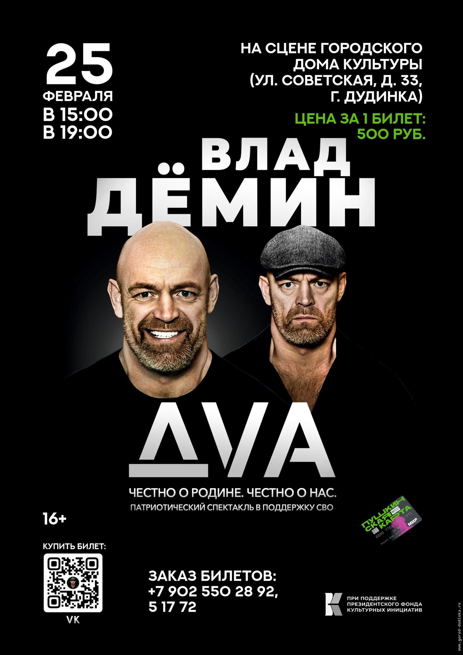 25 февраля в городском Доме культуры пройдут показы моноспектакля «ДВА. Честно о Родине. Честно о нас» известного российского актера Владислава Демина. В основе спектакля лежит история о том, как в одном человеке могут сражаться два патриота — истинный, готовый оставаться со страной в любой ситуации, и патриот испуганный, готовый бежать куда угодно и каким угодно способом, бросая все. Сам автор отмечает, что получилось создать трагикомедию, когда с искрометным юмором и развлекательными эпизодами соседствуют драма и подчас фатальные события.