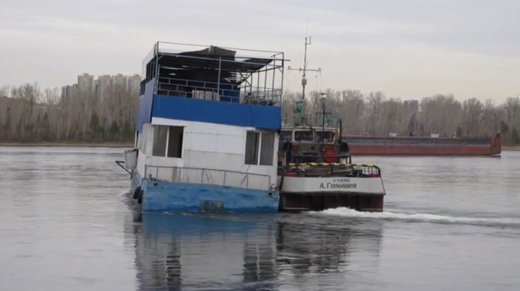 В Красноярске отбуксировали плавучее кафе "Гавань", стоявшее за ТЦ "Красноярье"