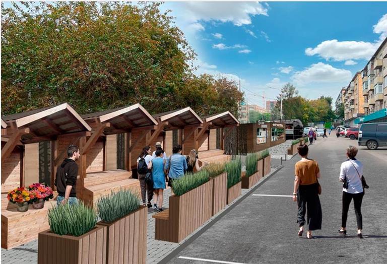 На улице Высотной появятся десять деревянных прилавков, скамейки и вазоны. На Металлургов – 11 прилавков, установят перголу, сделают тротуар и пешеходные дорожки. На Павлова – 36 прилавков и сделают живую изгородь вдоль пешеходной зоны, оборудуют парковку.