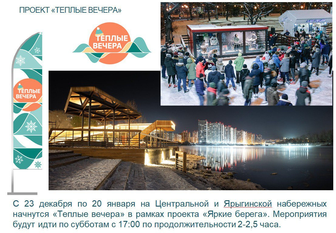 Местом проведения мероприятий станут Центральная и Ярыгинская набережные. Новый вариант проекта называется "Тёплые вечера". С 23 декабря по субботам в 17:00 для красноярцев и гостей города будут открываться развлекательные локации. Время работы составит всего 2-2,5 часа. Сам проект завершится 20 января. Подробности пока не сообщаются.