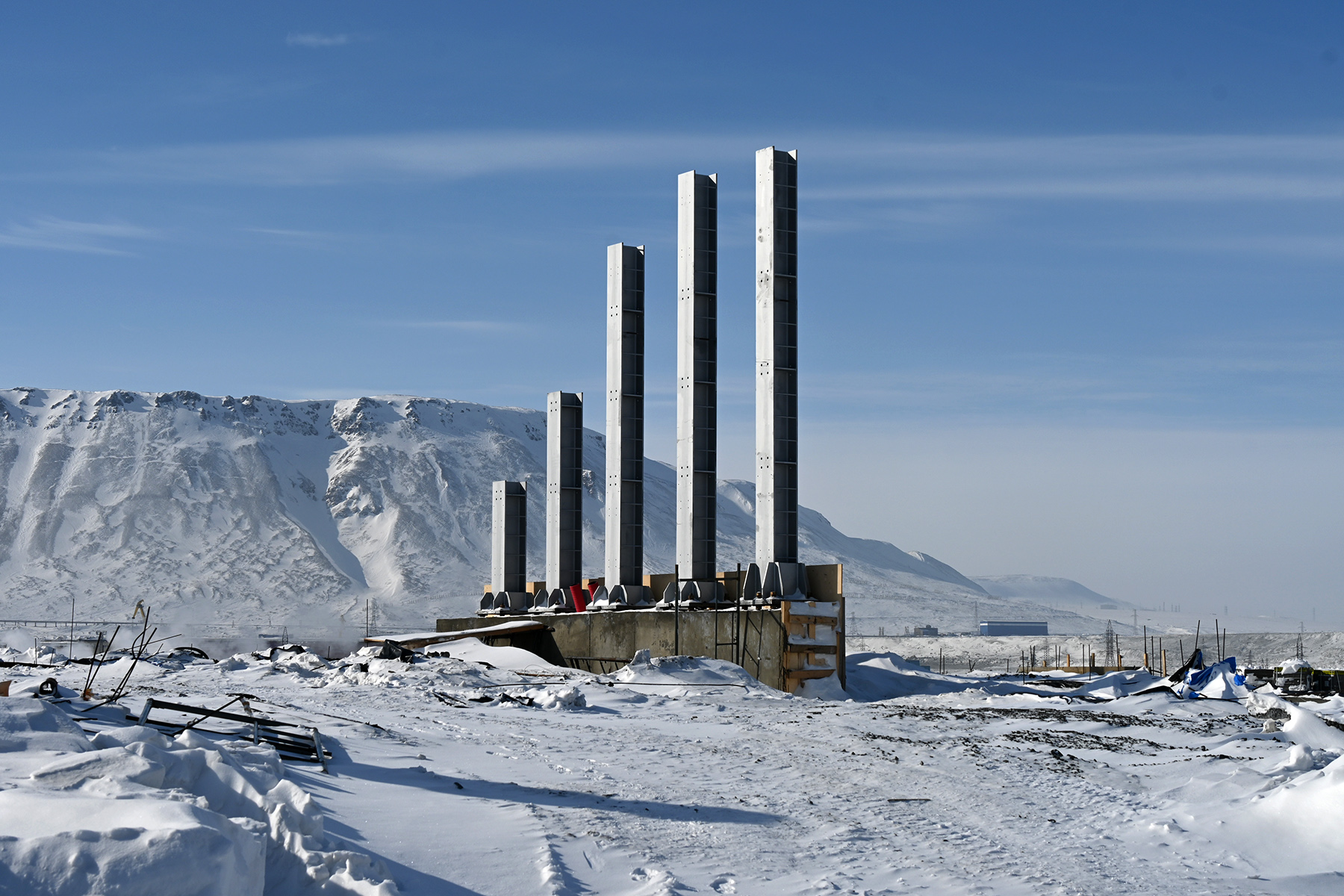Год назад на месте нынешней стройки сняли декоративное сооружение «Солнечные часы» . На площадке началась работа, а в Норильск поехали строительные материалы и конструкции. Однако изготовление 30-метровой стелы и ее доставка опаздывали. Сооружение пришлось везти зимой морским путем. По этой причине глава Норильска принял решение перенести открытие стелы.