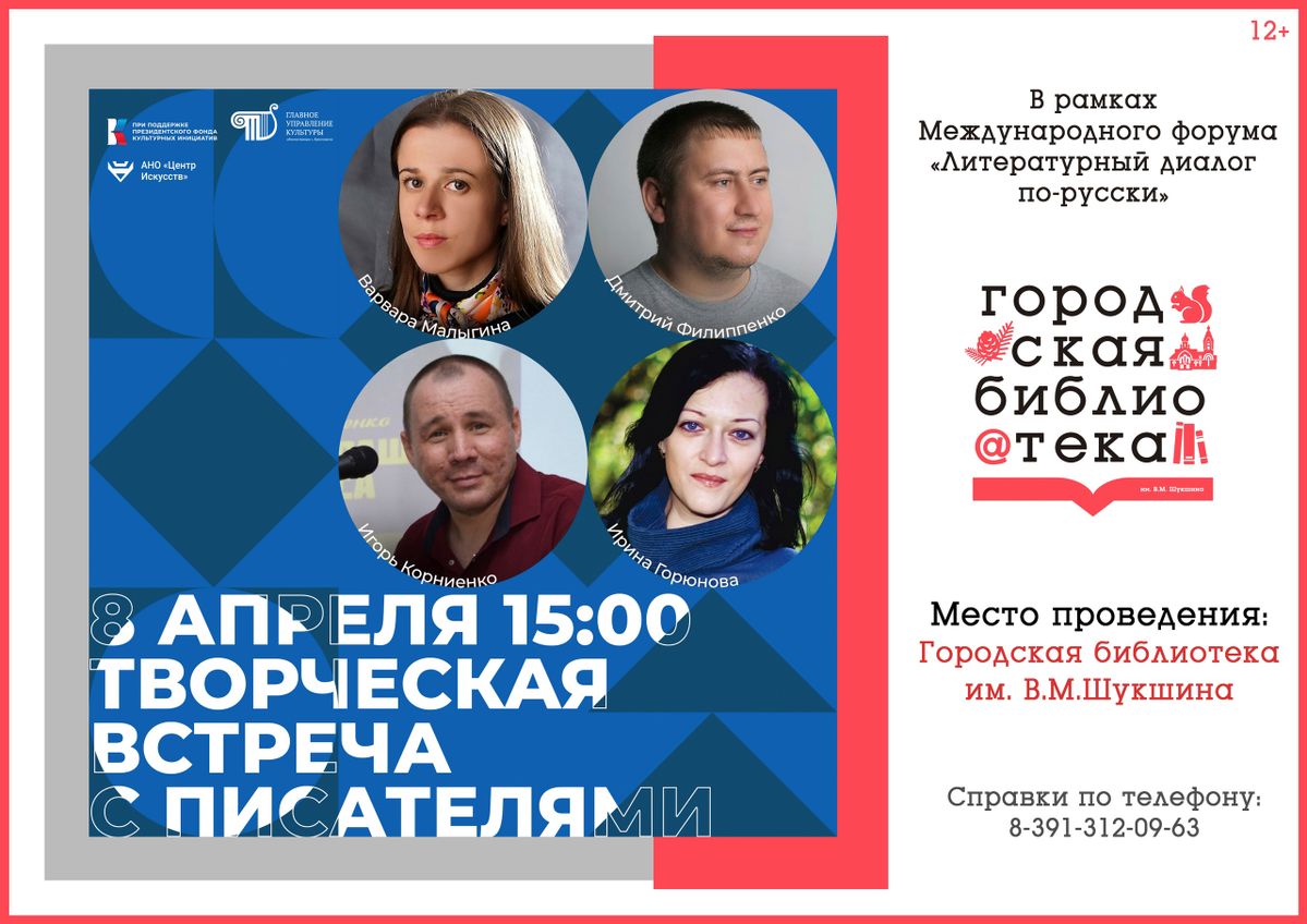 8 апреля в "Шукшинке" пройдёт встреча с известными писателями. В городскую библиотеку имени Василия Шукшина приедут Варвара Малыгина, Дмитрий Филиппенко, Игорь Корниенко и Ирина Горюнова.