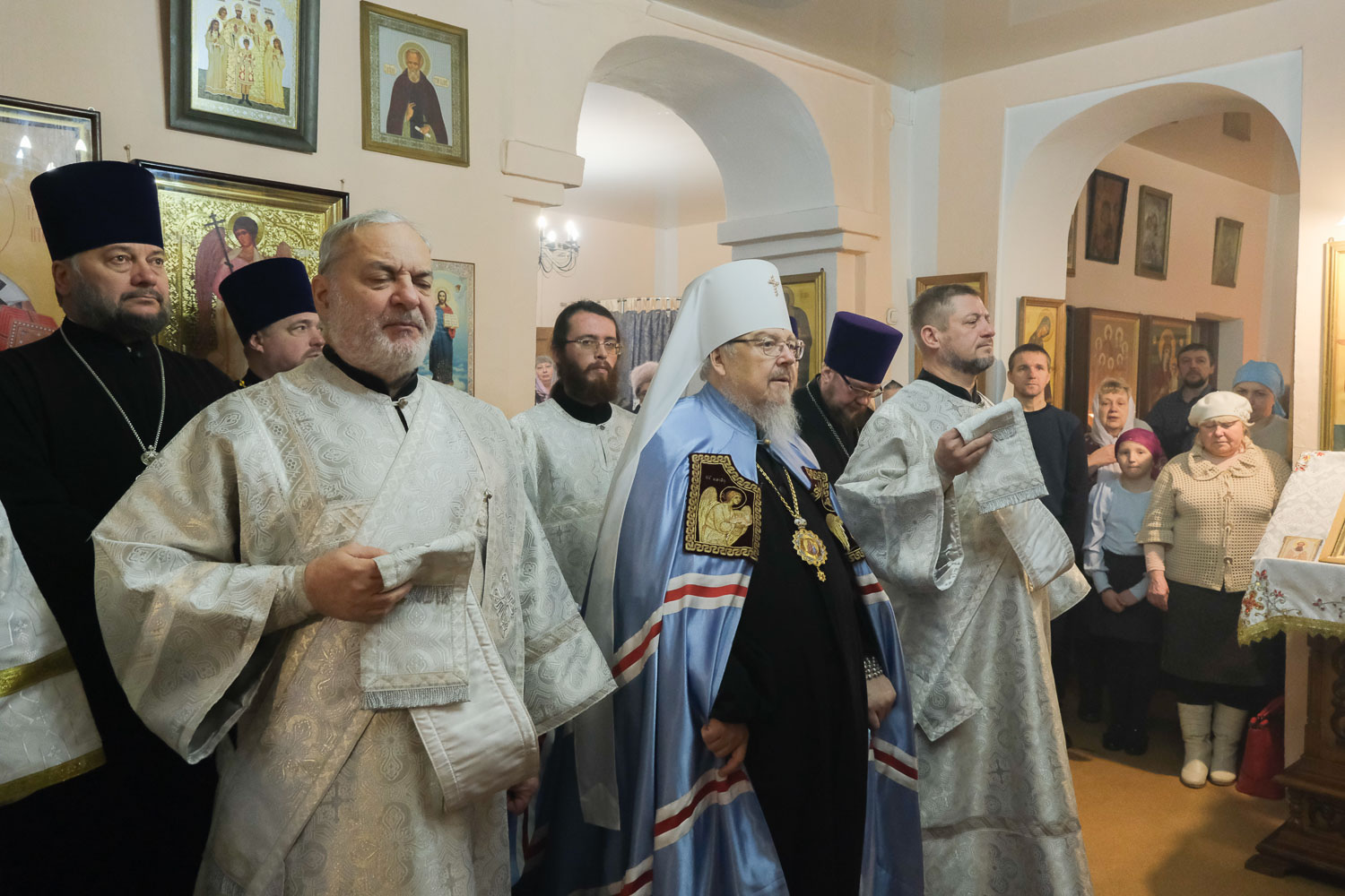 Его Высокопреосвященству сослужили: руководитель Административного секретариата Красноярской епархии, настоятель Покровского кафедрального собора города Красноярска митрофорный протоиерей Владимир Дорош; благочинный больничных храмов Красноярска, настоятель красноярских храмов апостола Андрея Первозванного и великомученика Димитрия Солунского иерей Виталий Вальтер; настоятель храма Иосифа Обручника и Святого Семейства протоиерей Анатолий Ридкоус; ключарь Покровского кафедрального собора города Красноярска иерей Игорь Лыткин.