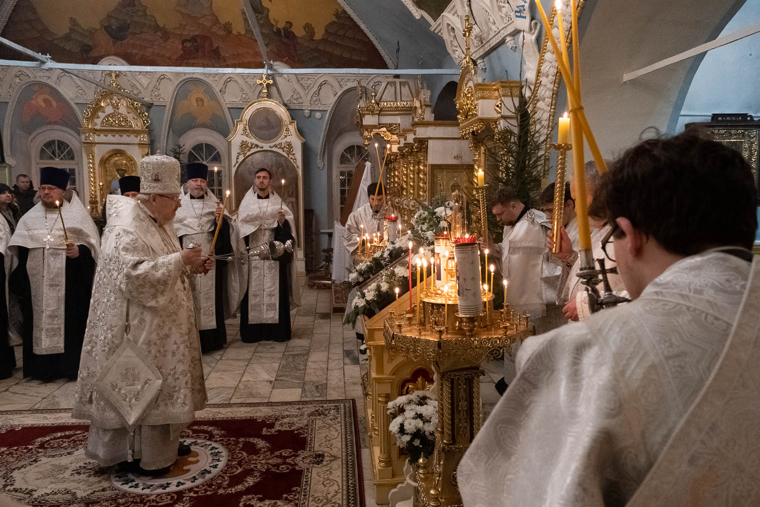 Его Высокопреосвященству сослужили: руководитель Административного секретариата Красноярской епархии, настоятель Покровского кафедрального собора города Красноярска митрофорный протоиерей Владимир Дорош; секретарь Красноярской епархии, благочинный церквей Левобережного городского округа Красноярска, наместник красноярского Успенского мужского монастыря игумен Иннокентий (Нилов); благочинный больничных церквей города Красноярска, настоятель красноярских храмов апостола Андрея Первозванного и великомученика Димитрия Солунского иерей Виталий Вальтер; ключарь Покровского собора иеромонах Мелхиседек (Цхадая).