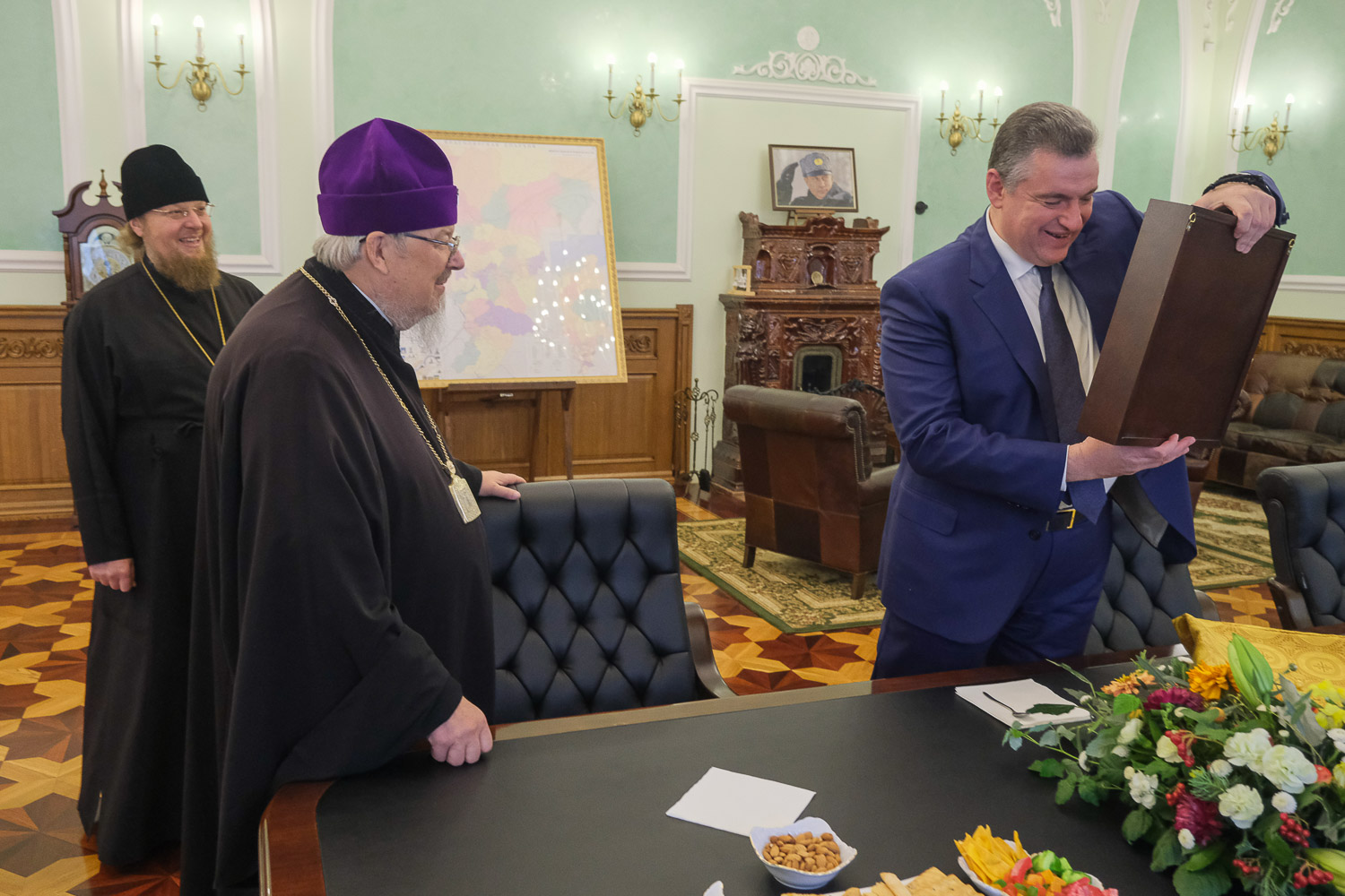 В начале встречи митрополит Пантелеимон и Леонид Эдуардович обменялись подарками: правящему архиерею была вручена икона великомученика Пантелеимона и цветы, в свою очередь митрополит подарил лидеру ЛДПР книгу об истории Архиерейского дома.