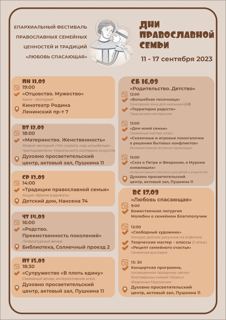 С 11 по 17 сентября 2023 года, по благословению Преосвященнейшего Агафангела, епископа Норильского и Туруханского, в рамках проведения епархиального фестиваля православных семейных ценностей и традиций «Любовь спасающая» в городе Норильске состоятся Дни православной семьи - ряд просветительских мероприятий, познавательных лекций, мастер-классов и творческих акций.