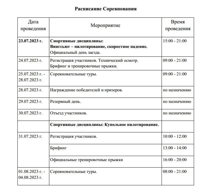Во вторник – 25 июля – соревновательными турами в дисциплинах «вингсьют-пилотирование» и «скоростное падение» на аэродроме «Танай» в Кузбассе откроются чемпионат и первенство России по четырём основным направлениям классического парашютного спорта (кроме вышеупомянутых – это классические дисциплины и «купольное пилотирование») .