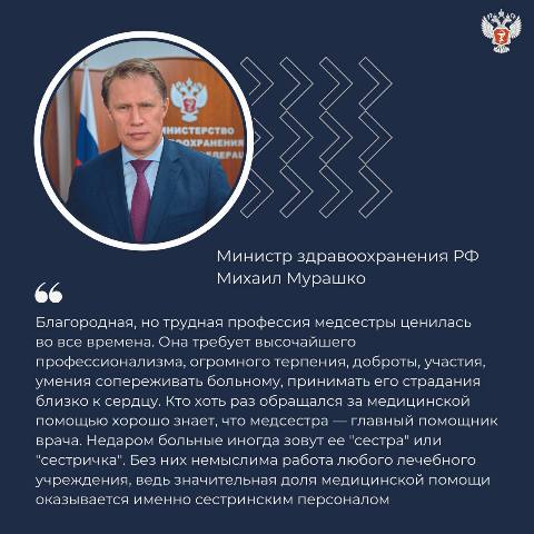 Благодарю всех медицинских сестер за бескорыстную помощь тем, кто в этом нуждается, за самоотверженный труд и верность профессии.» - сказал Михаил Мурашко.