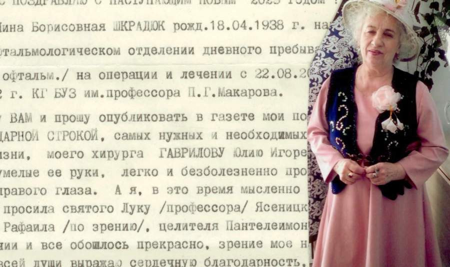 Я, Нина Борисовна Шкрадюк, 1938 года рождения, с 22 по 28 августа 2022 года находилась на операции и лечении в Красноярской краевой офтальмологической клинической больнице имени профессора П. Г. Макарова.