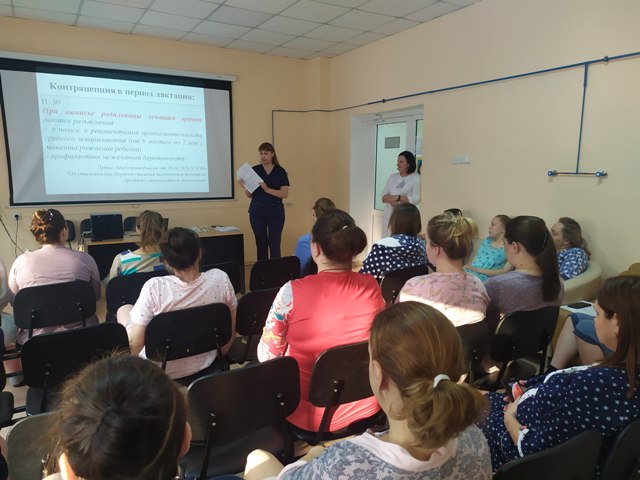 Пациенткам рассказали, какие основные рекомендации получают родильницы после выписки из родильного дома: о пользе и рекомендуемой продолжительности грудного вскармливания (от 6 месяцев до 2 лет с момента рождения ребенка), о профилактике нежелательной беременности в период лактации и о том, когда можно планировать следующую беременность.